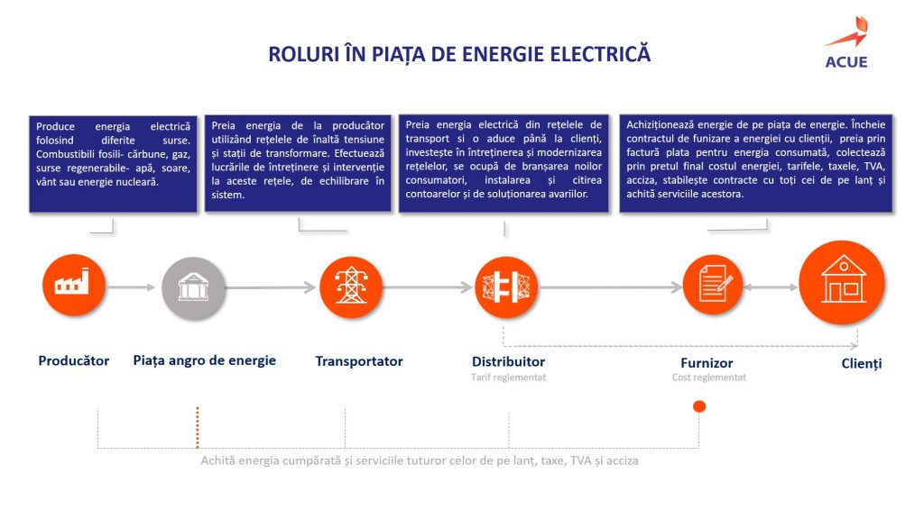Pe fluxul strict tehnic sunt implicați producătorul, transportatorul și distribuitorul de energie. Pe fluxul comercial are loc tranzacționarea energiei în piața specifică, comercializarea și facturarea acesteia, proces asigurat de furnizor.