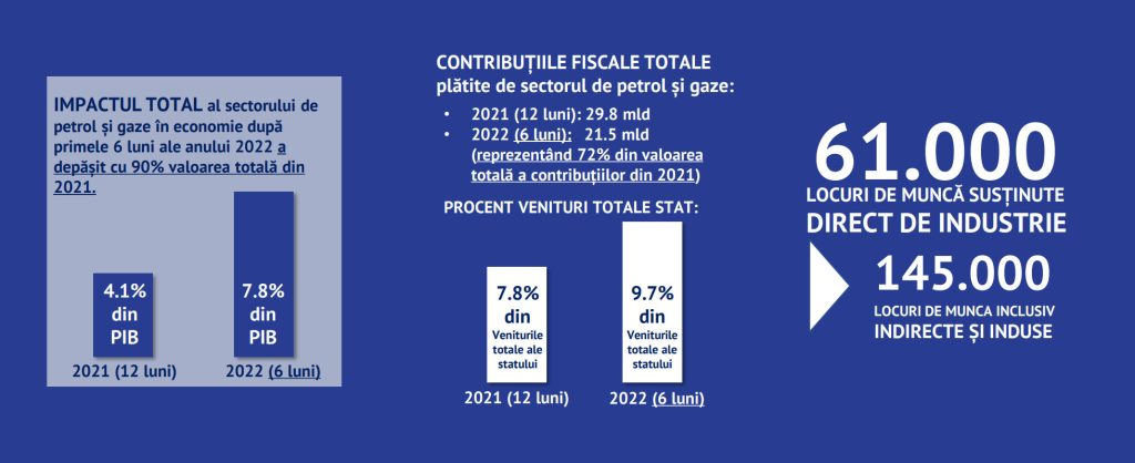 Industria de petrol și gaze rămâne astfel un contribuitor semnificativ la bugetul consolidat. Contribuțiile fiscale totale plătite de sector au crescut vertiginos în prima jumătate a anului 2022, reprezentând echivalentul a 9,7% din veniturile totale ale guvernului. Numai din supraimpozitarea veniturilor suplimentare din vânzările de gaze naturale, statul a încasat peste 6,2 miliarde lei în prima jumătate a anului 2022, echivalentul a 2,7% din veniturile totale ale bugetului general consolidat.