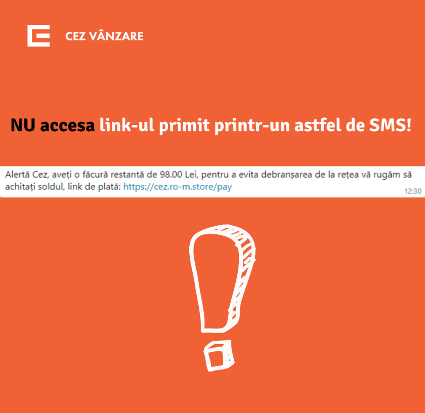 Mesajele conțin linkuri care direcționează către aplicația My CEZ pentru plată, în niciun caz către alte platforme de plată: link-urile atașate în mesaje care solicită introducerea datelor personale sau datele unui card bancar reprezintă tentative de fraudă.