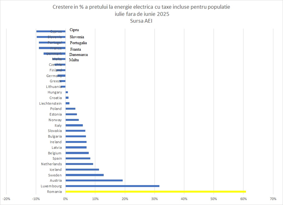 Dumitru Chisăliță analizează prețurile energiei electrice cu toate taxele incluse în țările din UE, la consumatorul casnic în luna iulie 2025: Constatăm că România ocupă locul 1 în rândul țărilor din Europa, raportat la puterea de cumpărare și are cea mai mare creștere a prețului energiei electrice din întreaga Europă între lunile iunie – iulie 2025, fiind mai mult decât dublă decât următoarea cea mai mare creștere de preț din Europa (România ocupă în luna iulie 2025, locul 10 la prețul energiei electrice pentru populație neraportat la puterea de cumpărare).