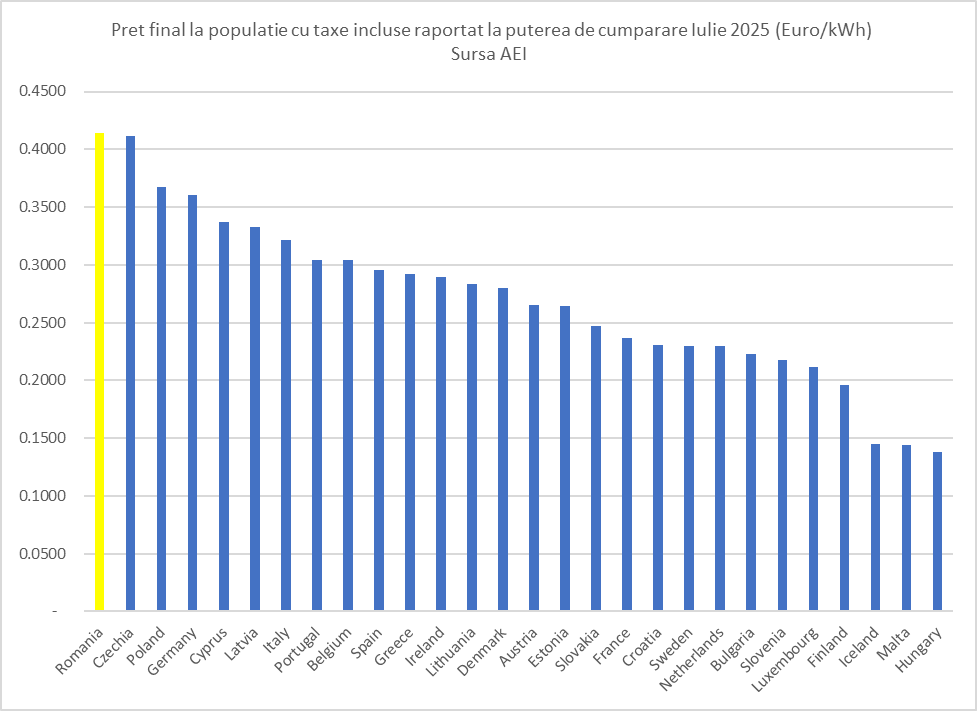 În fapt, în luna iulie 2025 România a înregistrat pentru populație cel mai mare preț al energiei electrice raportat la puterea de cumpărare din Europa.
