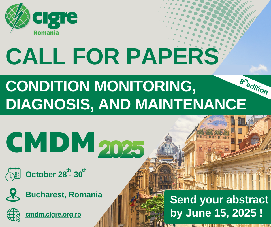 Comitetul Național Român CIGRE anunță deschiderea Call for Papers pentru cea de-a VIII-a ediție a conferinței internaționale CONDITION MONITORING, DIAGNOSIS, AND MAINTENANCE (CMDM) 2025, ce va avea loc între 28–30 octombrie, la București, la Hotel InterContinental Athénée Palace Bucharest.