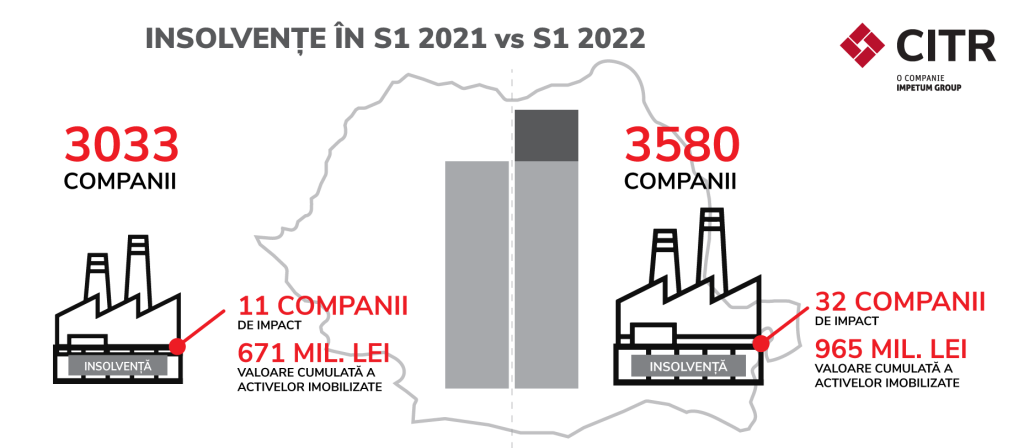 Potrivit CITR, numărul companiilor aflate în dificultate este mult mai mare. În prima jumătate a anului au intrat în insolvență 3.580 companii, aproximativ la același nivel față de semestrul întâi al anului trecut când 3.033 de companii au intrat în insolvență. Dintre acestea, 32 companii de impact din România au intrat în insolvență în semestrul I 2022, având o valoare cumulată a activelor imobilizate de 965 mil. lei, față de 11 companii în aceeași perioadă a anului trecut, ce aveau o valoare a activelor imobilizate de 671 mil. lei, arată o analiză CITR.