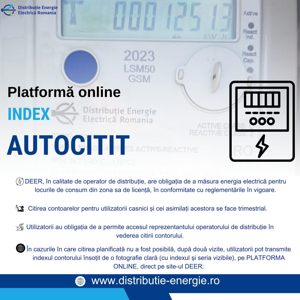 Pentru a facilita procesul, în cazurile în care citirea planificată nu a fost posibilă, după două vizite, utilizatorii pot transmite indexul contorului însoțit de o fotografie clară (cu indexul și seria vizibile), direct pe site-ul DEER: www.distributie-energie.ro, precizează compania.