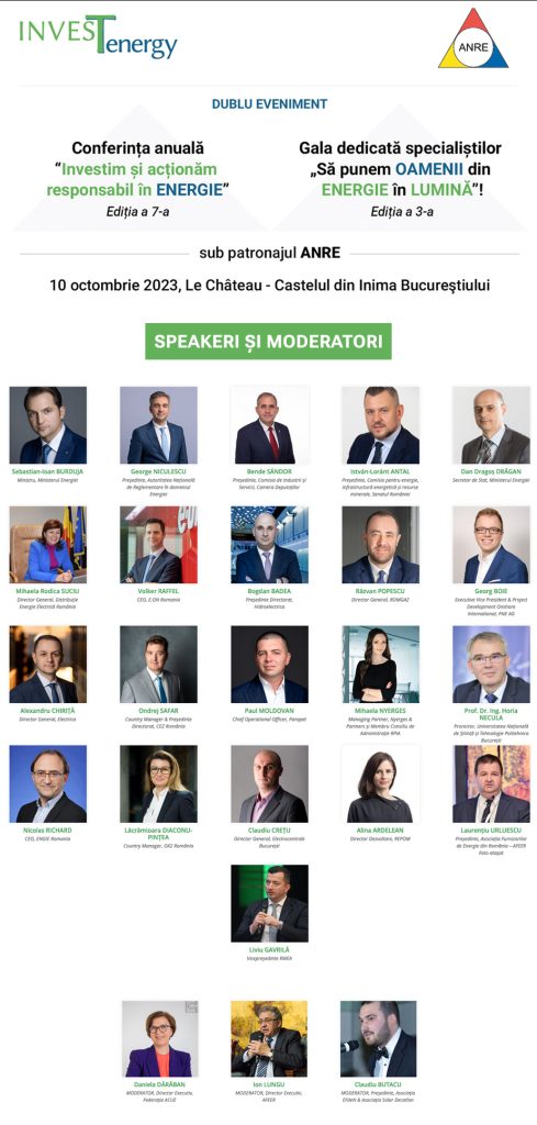 Publicația InvesTenergy continuă tradiția și organizează un Dublu eveniment, pe 10 octombrie: Conferința anuală InvesTenergy cu tema “Investim și acționăm responsabil în ENERGIE”, ediția a 7-a și Gala InvesTenergy dedicată Specialiștilor „Să punem Oamenii din Energie în lumină!”, ediția a 3-a. Evenimentul se desfășoară sub patronajul Autorității Naționale de Reglementare în domeniul Energiei – ANRE.