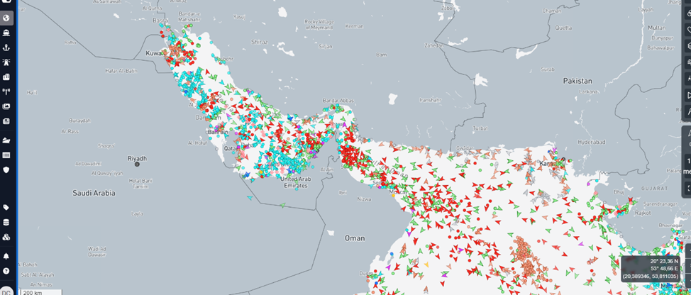 250 de nave în așteptare la intrarea/ieșirea din Strâmtoarea Ormuz. Conform datelor MarineTrafic, cca. 150 de tancuri crude & LNG sunt ancorate în Golful Persic, alte cca. 100 de nave cargo și petroliere sunt staționate în apropierea coastelor EAU și Oman. Companiile evită intrarea în strâmtoare. Multe din navele deja aflate în Golf nu finalizează tranzitul. În teoria logistică, aceasta este faza pre-blocaj: înghețarea fluxului înaintea opririi formale.