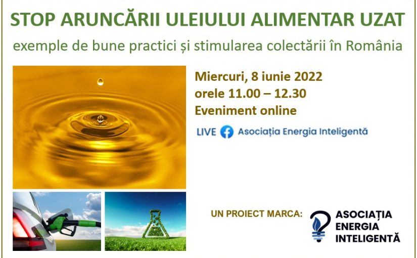 Asociația Energia Inteligentă organizează miercuri, 8 iunie 2022, orele 11.00 – 12.30, evenimentul „Stop Aruncării Uleiului Alimentar Uzat – exemple de bune practici și stimularea colectării în România”.