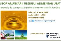 Asociația Energia Inteligentă organizează miercuri, 8 iunie 2022, orele 11.00 – 12.30, evenimentul „Stop Aruncării Uleiului Alimentar Uzat – exemple de bune practici și stimularea colectării în România”. Un studiu realizat de Deloitte, la inițiativa Asociației Energia Inteligentă privind utilizarea uleiului alimentar uzat pentru producerea de biocombustibil, arată că România este abia la începutul implementării … Continuă să citești Eveniment online „Stop Aruncării Uleiului Alimentar Uzat – exemple de bune practici și stimularea colectării în România”, 8 iunie