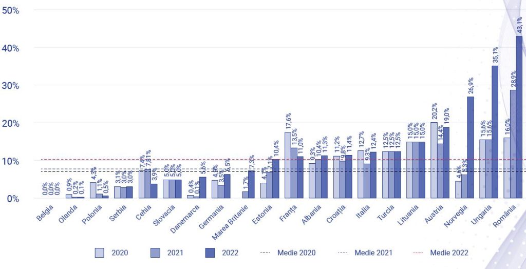 La nivel european, România înregistrează „de departe cea mai ridicată rată de impozitare efectivă în anii 2022 şi 2021, situându-se la un nivel de 4 ori mai mare decât media simplă a ratelor efective de impozitare identificate în celelalte state europene”, potrivit studiului „Analiza sistemului de impozitare specific sectorului upstream al ţiţeiului şi gazelor naturale din România”, realizat de Biriș Goran pentru Federația Patronală de Petrol și Gaze (FPPG).