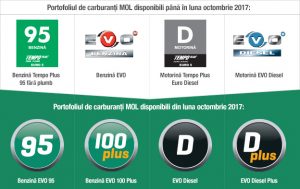 În România, noua gamă de carburanţi EVO va fi disponibilă în toate cele 208 staţii MOL începând cu luna octombrie. Astfel, motorina comercializată până în prezent sub numele Tempo Plus Euro Diesel va fi înlocuită de noua EVO Diesel, iar Benzina Tempo Plus 95 fără plumb va fi înlocuită de sortimentul Benzină EVO 95. Modificări vor avea loc şi în gama premium, unde motorina comercializată în prezent sub numele de EVO Diesel va fi înlocuită cu produsul EVO Diesel Plus, iar benzina premium comercializată sub numele Benzină EVO va fi înlocuită cu produsul Benzină EVO 100 Plus, o benzină nouă, îmbunătăţită, cu cifră octanică de minimum 100. Toţi carburanţii din gama EVO sunt noi, cu proprietăţi îmbunătăţite, care asigură o curăţare mai eficientă a motorului, concomitent cu o protecţie de durată, se precizează într-un comunicat al companiei.