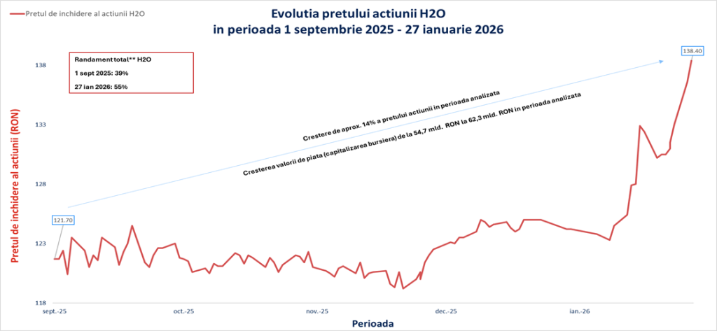 În intervalul 1 septembrie 2025 – 27 ianuarie 2026, acțiunea Hidroelectrica a înregistrat o apreciere de aproximativ 14%, evoluție care reflectă interesul constant și în creștere al investitorilor față de strategia de investiții și dezvoltare a companiei, stabilitatea financiară și perspectivele favorabile pe termen mediu și lung.