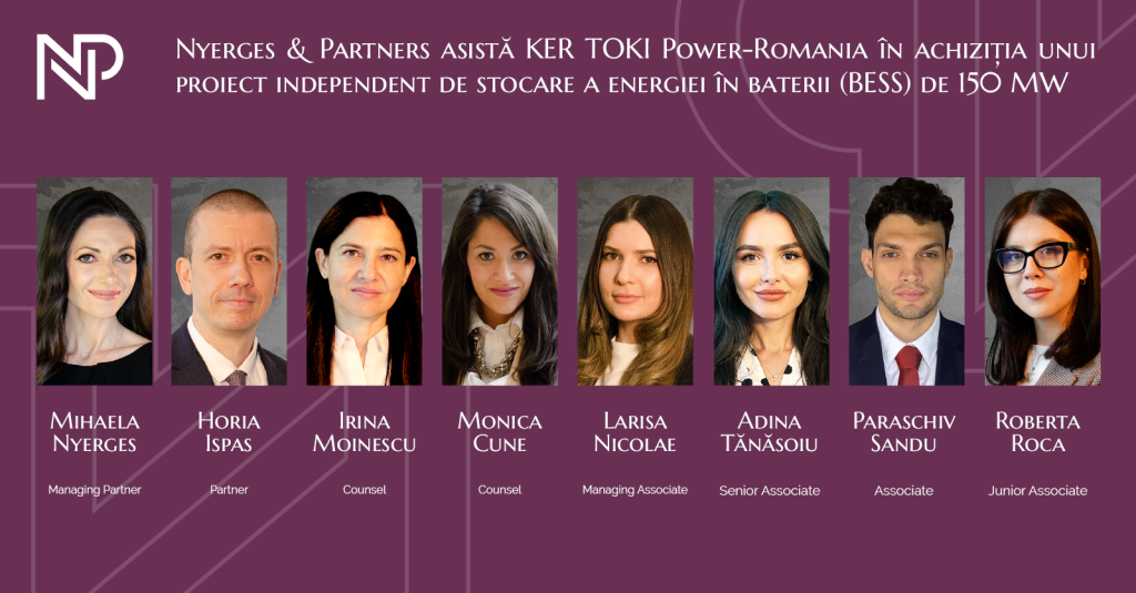 Nyerges & Partners a asistat KER TOKI, divizia de trading de energie a grupului de investiții în regenerabile și e-mobilitate Renalfa Solarpro Group, cu sediul la Viena, în achiziția unui proiect independent de sistem de stocare a energiei în baterii (BESS) cu o capacitate de 150 MW în România.