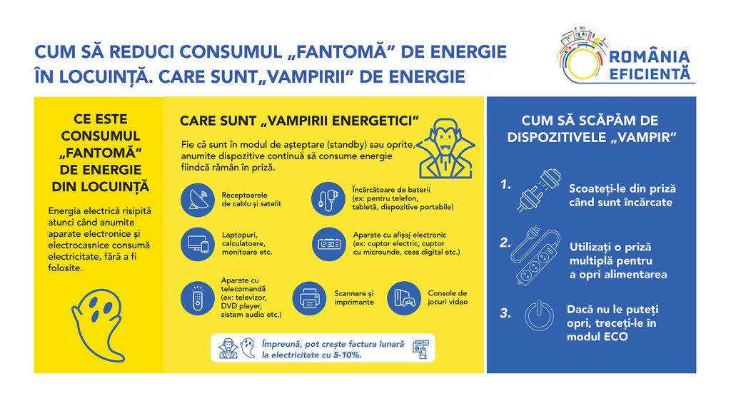 Casele noastre sunt tot mai pline de dispozitive electronice și electrocasnice care necesită energie, cum ar fi încărcătoare de telefoane, televizoare, laptopuri, boxe, console de jocuri, aparate cu microunde, imprimante și altele. Chiar dacă aceste aparate sunt din ce în ce mai eficiente pe măsură ce tehnologia evoluează, ele continuă să folosească energie chiar și atunci când sunt oprite sau în regim de așteptare (standby). Din acest motiv, li se mai spune și „vampiri energetici”. Consumul acestora poate însemna în total un plus de aproximativ 5-10% în factură, potrivit unor estimări, sau chiar de circa 20%, potrivit altora. Pentru că adesea trece neobservat, este denumit consum „fantomă” de electricitate.
