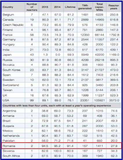 România continuă să ocupe primul loc în lume cu un factor mediu de capacitate de la punerea în funcțiune a celor două unități nucleare de la CNE Cernavodă de 91,4%, dintr-un total de 387 de reactoare nucleare aflate în operare la sfărșitul lunii decembrie 2015, conform publicatiei “Nuclear Engineering International”.