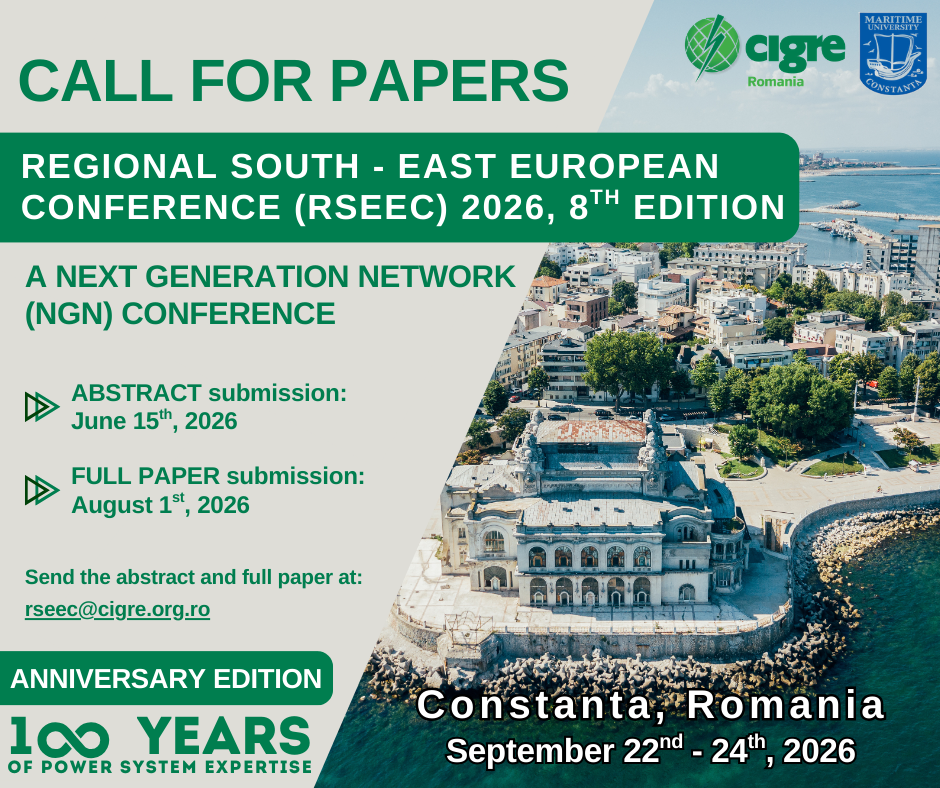 Comitetul Național Român CIGRE anunță deschiderea Call for Papers pentru cea de-a VIII-a ediție a conferinței internaționale REGIONAL SOUTH-EAST EUROPEAN CONFERENCE (RSEEC) 2026 – A NEXT GENERATION NETWOTK CONFERENCE, ediție aniversară care marchează 100 de ani de la fondarea CIGRE România. Evenimentul va avea loc între 22 – 24 septembrie 2026, la Universitatea Maritimă din Constanța.