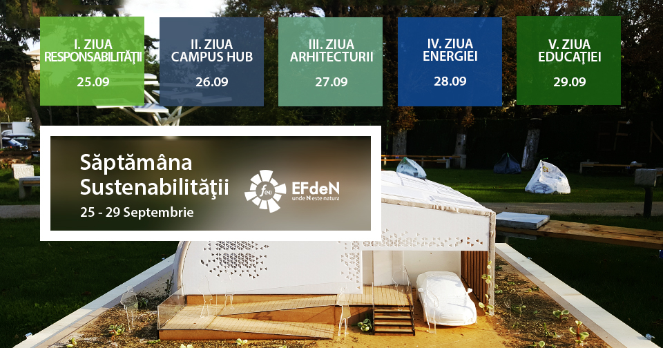 Echipa EFdeN continuă tradiția şi organizează, pentru al treilea an la rând, Săptămâna Sustenabilității EFdeN. Cele cinci zile ale evenimentului acoperă tematici diferite din sfera sustenabilității, precum inovație, energie regenerabilă, arhitectură, educație, reunind sub acelaşi format reprezentanți ai mediului privat, public, academic și non-guvernamental.