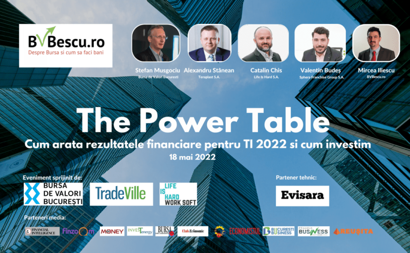 Dupa incheierea perioadei de raportari, pe data de 18 mai 2022, rezultatele publicate de aproximativ 30 cele mai populare companii listate in randul investitorilor de la Bursa de Valori Bucuresti vor fi discutate in cadrul celei de-a 2-a editii a evenimentului The Power Table – Cum arata rezultatele financiare si cum investim.