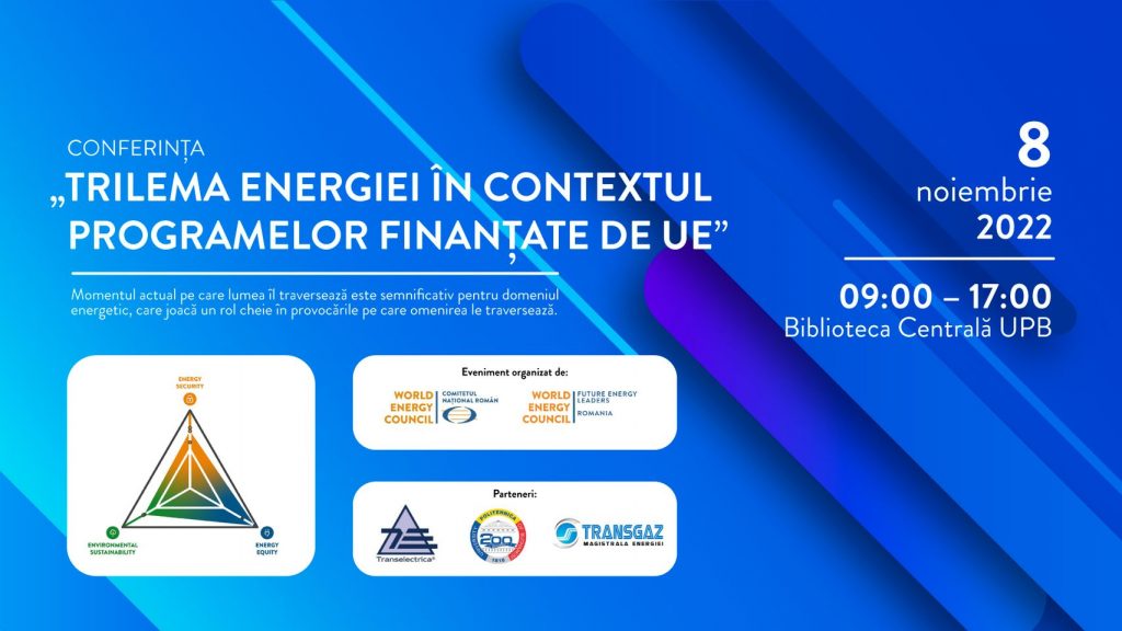 Comitetul Național Român al Consiliului Mondial al Energiei (CNR-CME) împreună cu Future Energy Leaders Romania – FEL România organizează conferința cu tema: „Trilema energiei în contextul programelor finanțate de UE”, în data de 8 noiembrie, la Biblioteca Centrală a Universității Politehnica București.