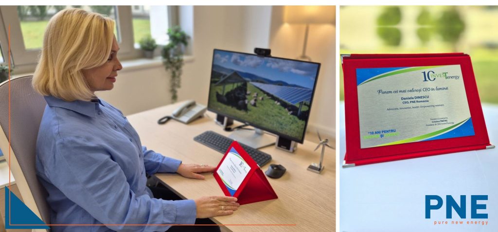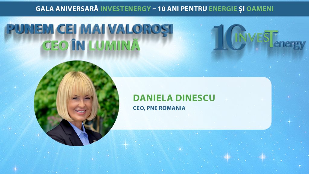 În cadrul Galei InvesTenergy – 10 ani pentru Energie și Oameni, ca o recunoaștere a dedicării remarcabile, InvesTenergy a acordat Danielei Dinescu, CEO PNE România, distincția aniversară în semn de apreciere pentru întreaga sa activitate în sprijinul industriei energiei regenerabile și pentru leadership-ul său vizionar.
